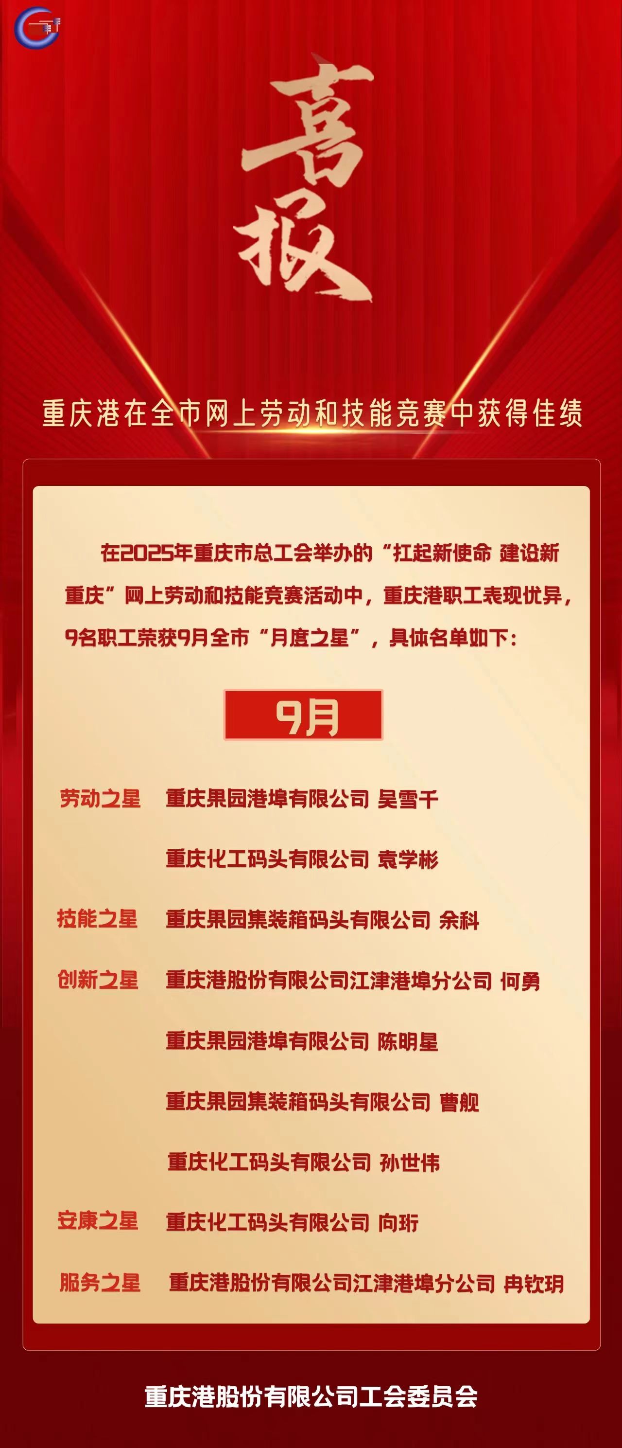 喜报!重庆港在全市9月网上劳动和技能竞赛中获得佳绩